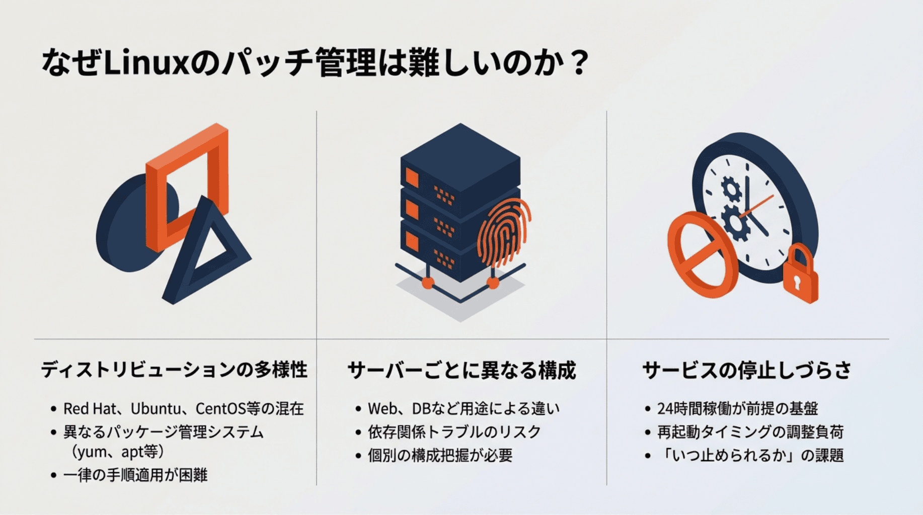 Windows環境では、Microsoftから提供される月例パッチを一斉適用する運用が一般的です。しかし、Linuxではそうはいきません。Linuxサーバーのパッチ管理を特に難しくしている要因は、大きく3つあります。
