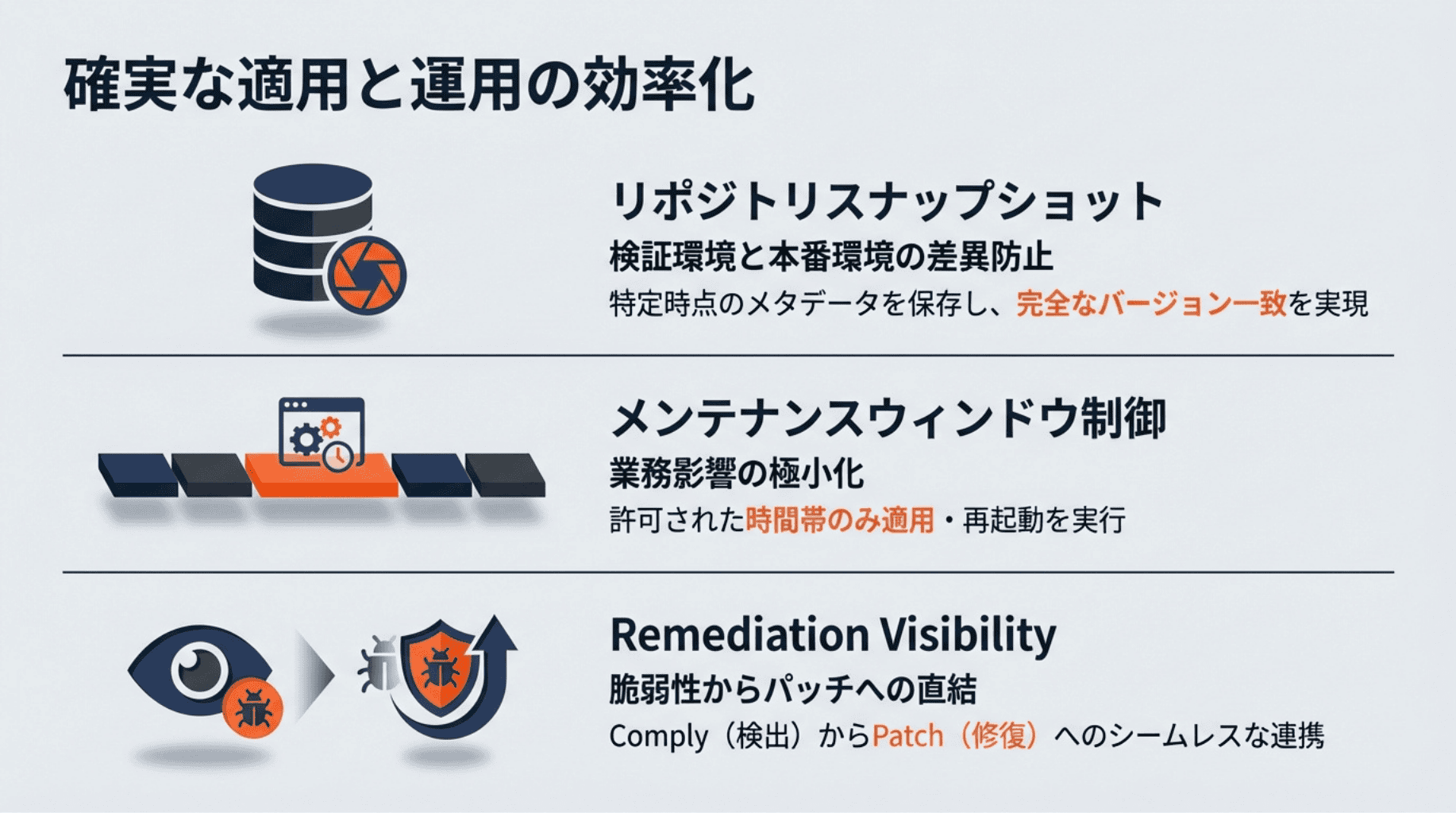 Linuxのリポジトリ情報は日々更新されます。そのため、検証環境でパッチ適用の影響を確認したタイミングと、実際に本番環境へ適用するタイミングでは、リポジトリ内のパッケージ情報に差異が生じるケースがあります。「検証で問題なかったのに本番で違うバージョンが入った」という事態は、現場にとって大きなリスクです。