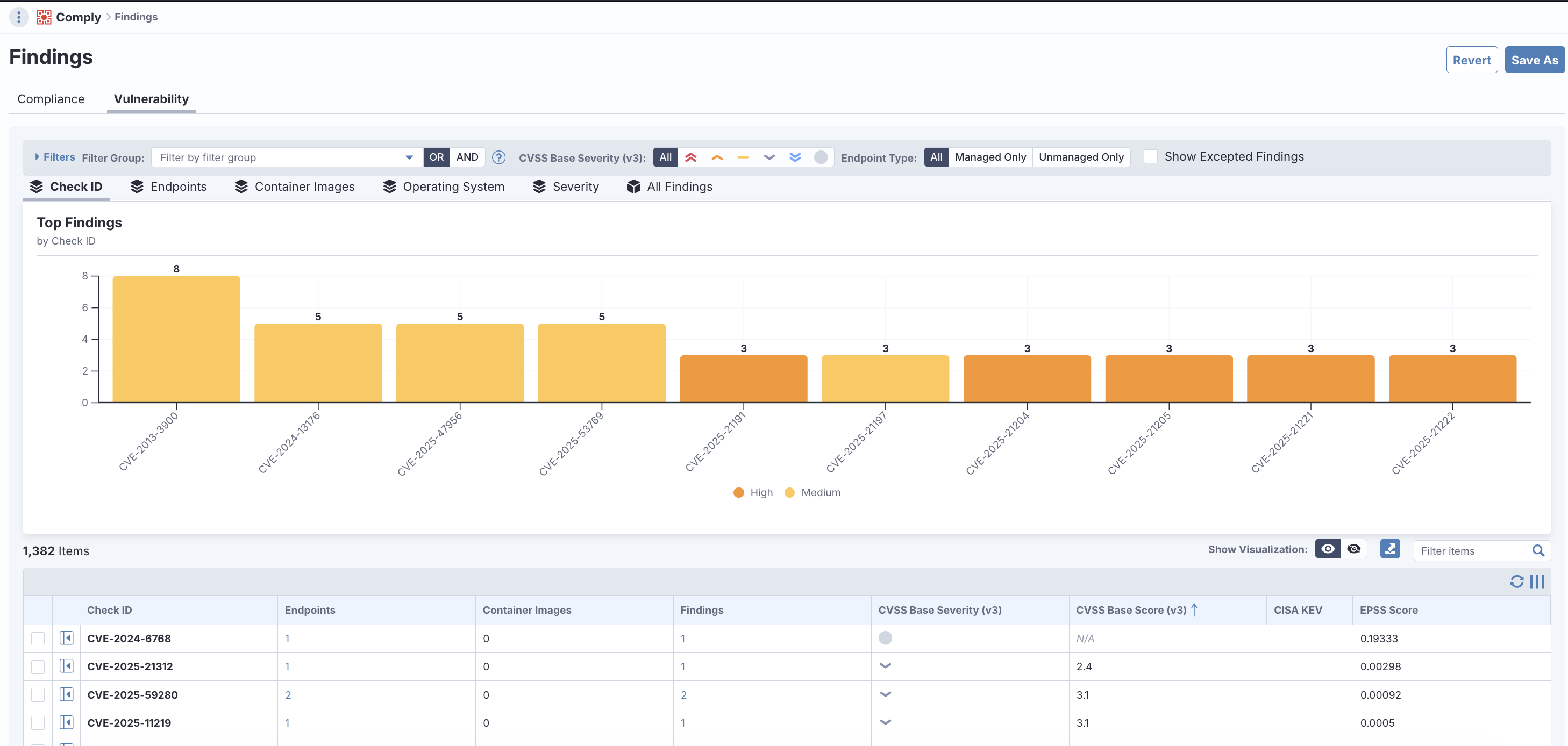 - 優先順位の決定: すべてのパッチを即座に適用するのが難しいLinuxサーバーに対しては、リスクの高いものから対応する必要があります。Tanium Complyはスキャン結果として、CVSSでの深刻度に加え、KEV、EPSSなど脆弱性対応の優先度を判断するための情報を提供し、判断を支援します。