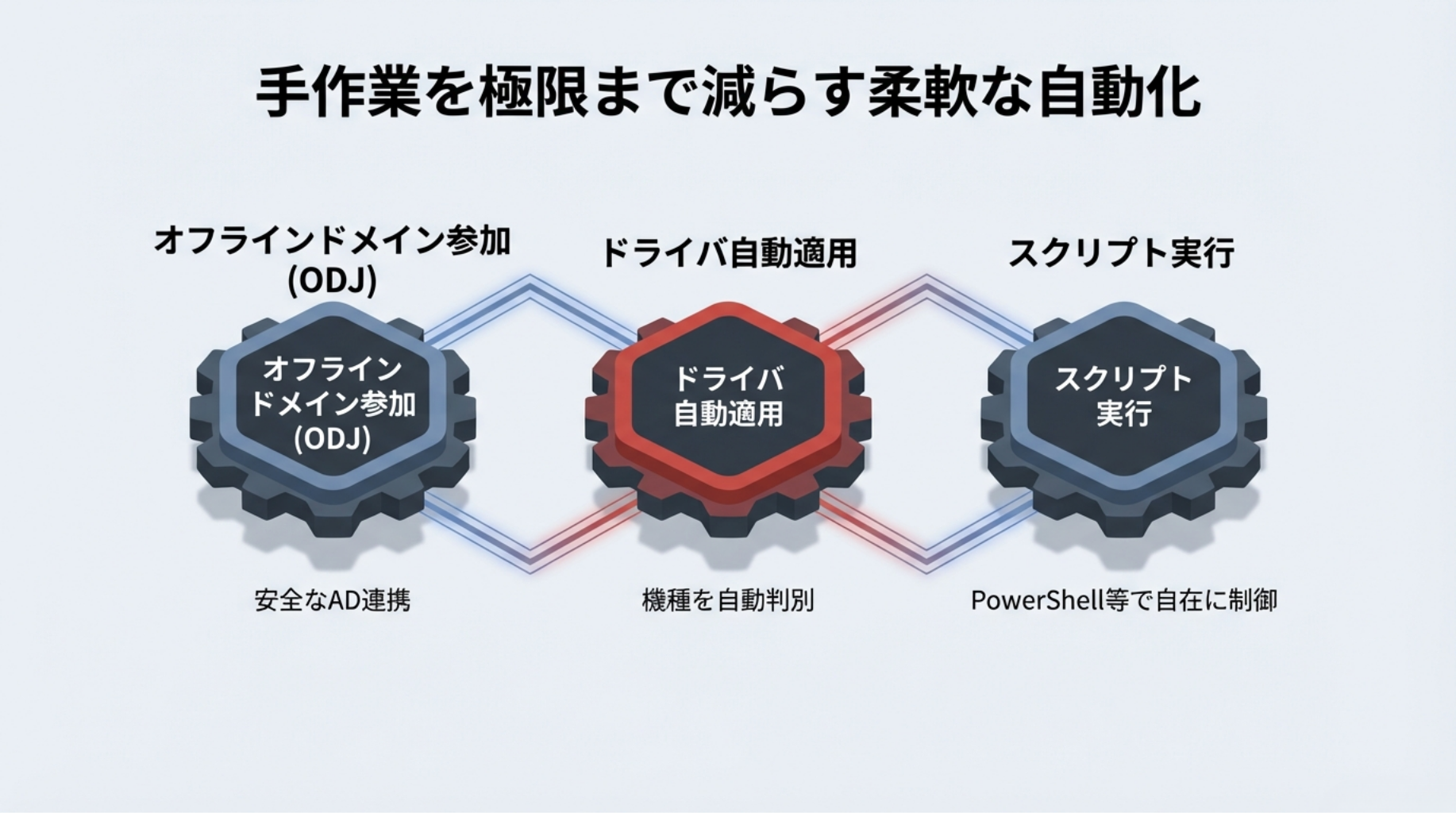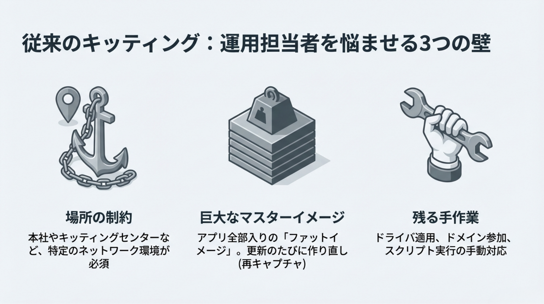 - どうしても手作業が伴う: ドライバの適用やドメイン参加、個別のスクリプト実行など、展開プロセスにおいて手作業が残ってしまいます。