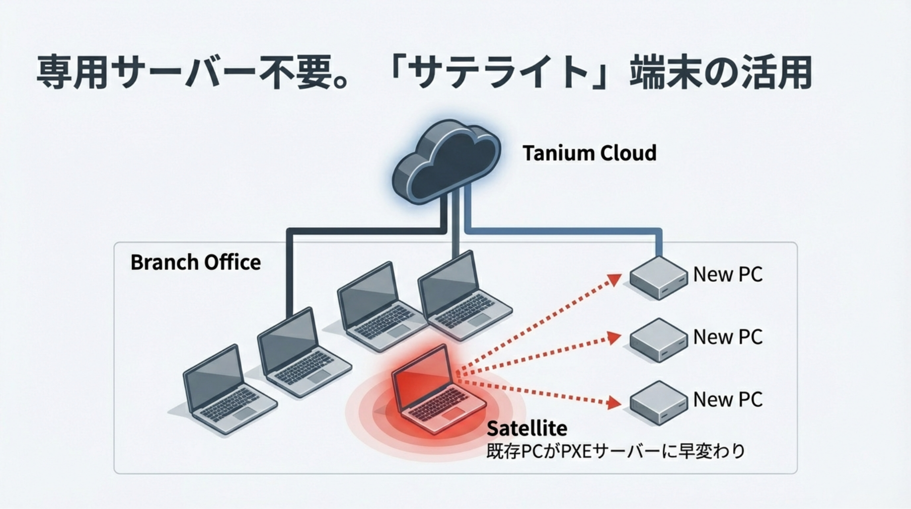 Provision機能のアーキテクチャのキーとなるのが、「サテライト(PXE端末)」と呼ばれる中継端末を各拠点に配備する仕組みです。 サテライトのセットアップに複雑な専用サーバーの構築作業は必要ありません。すでにTanium ClientがインストールされているWindows、macOS、またはLinux端末があれば、コンソールから遠隔で指定するだけで、PXEサーバーやキャッシュサーバーとして機能させることができます。サテライト機能に必要なプログラム資材もTaniumの仕組みを使って自動的に運用・配付されるため、特別な管理の手間はかかりません。