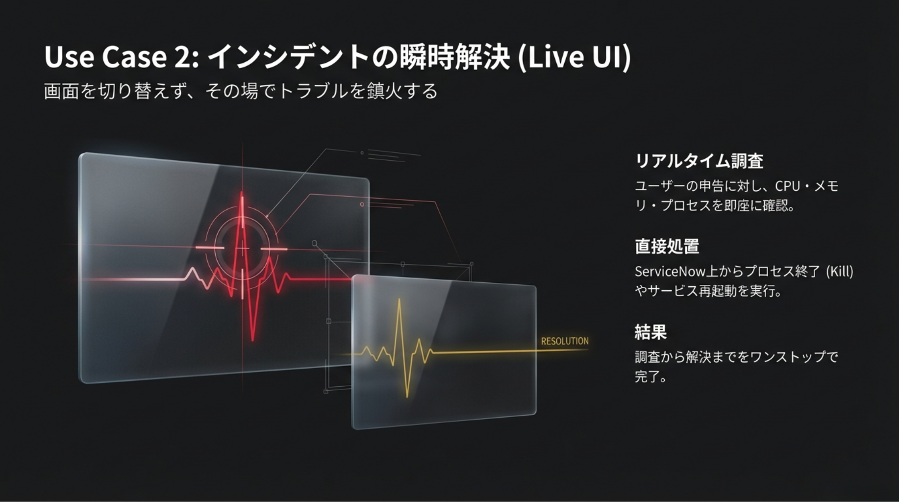 ユーザーから「PCの動作が遅い」といったインシデントが起票された際、担当者はServiceNowの画面から直接「Tanium Live UI」を起動できます。対象端末のCPUやメモリ使用量、実行中のプロセスやサービスなどをリアルタイムに確認し、問題を発見した場合はServiceNow上から直接プロセスを終了(Kill)させたり、サービスを再起動させたりして即座に解決に導くことができます。