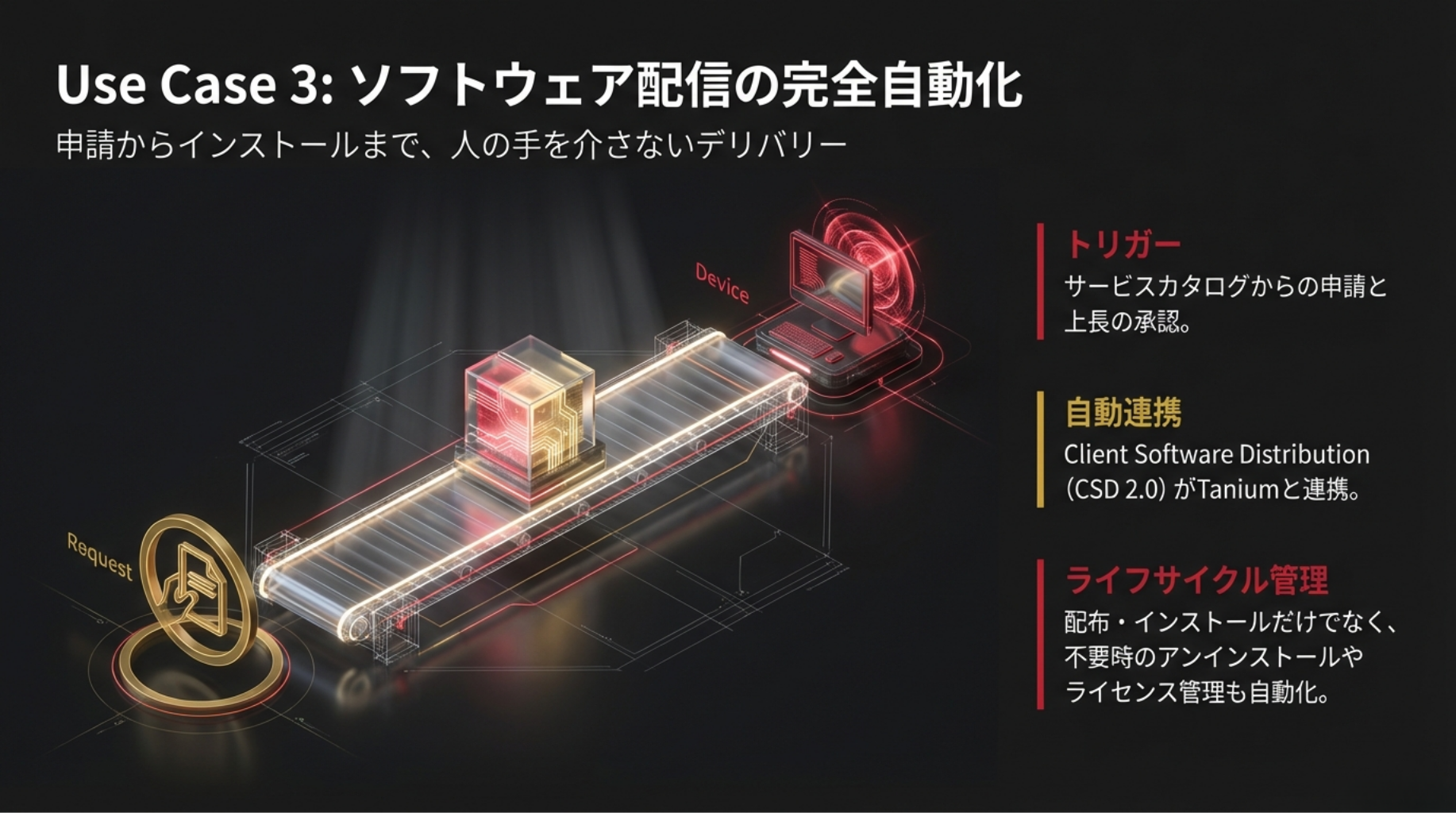 ユーザーがServiceNowのサービスカタログから必要なアプリケーションをリクエストすると、上長の承認をトリガーとしてClient Software Distribution(CSD 2.0)が連携し、Taniumが自動的に対象の端末へソフトウェアを配信・インストールします。不要になった際のリモート削除(アンインストール)やライセンス管理の自動化も可能です。