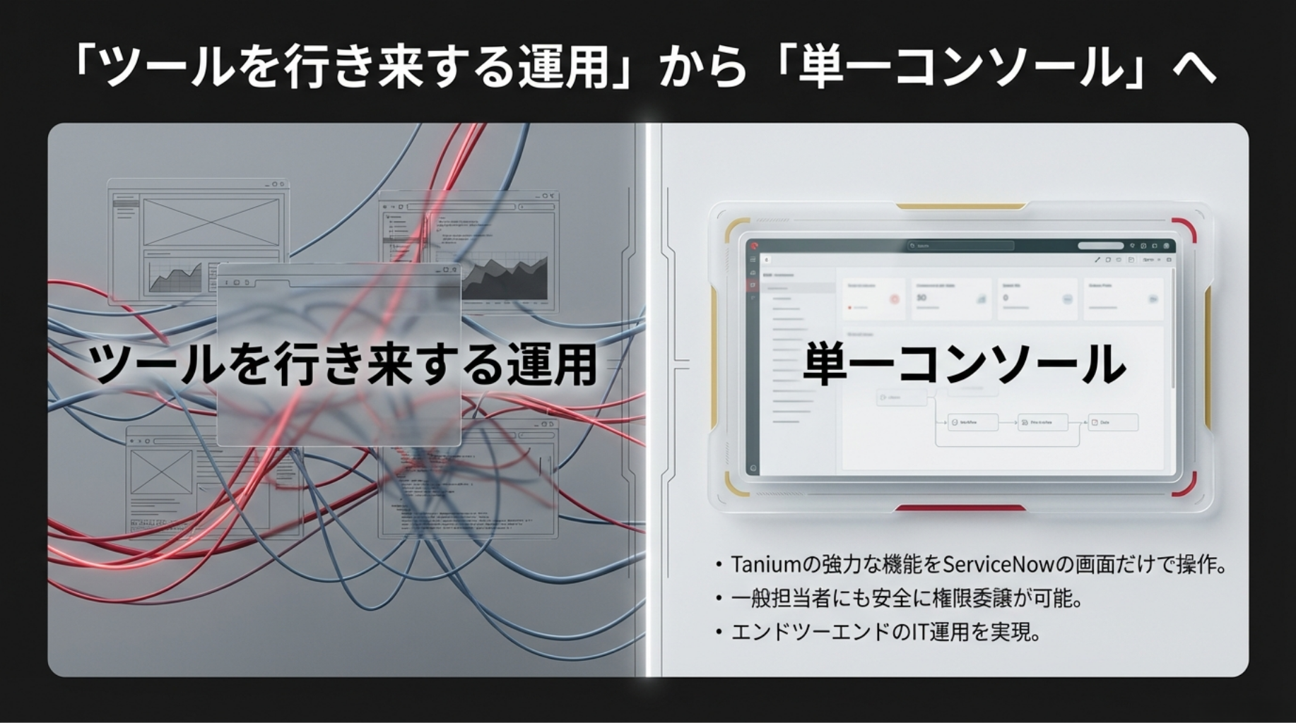 TaniumとServiceNowの統合により、企業は「単一のコンソールからのエンドツーエンドのIT運用」という理想像を実現できます。