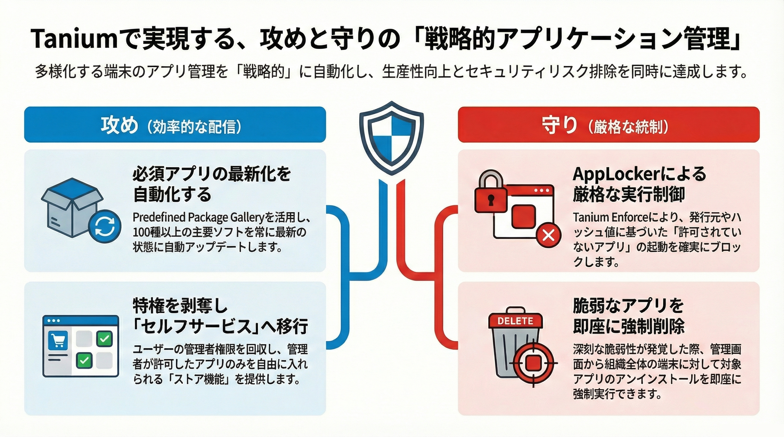 このようにTaniumの機能を組み合わせることで、セキュリティと利便性を両立させた「戦略的なアプリケーション管理」が実現できるのです。