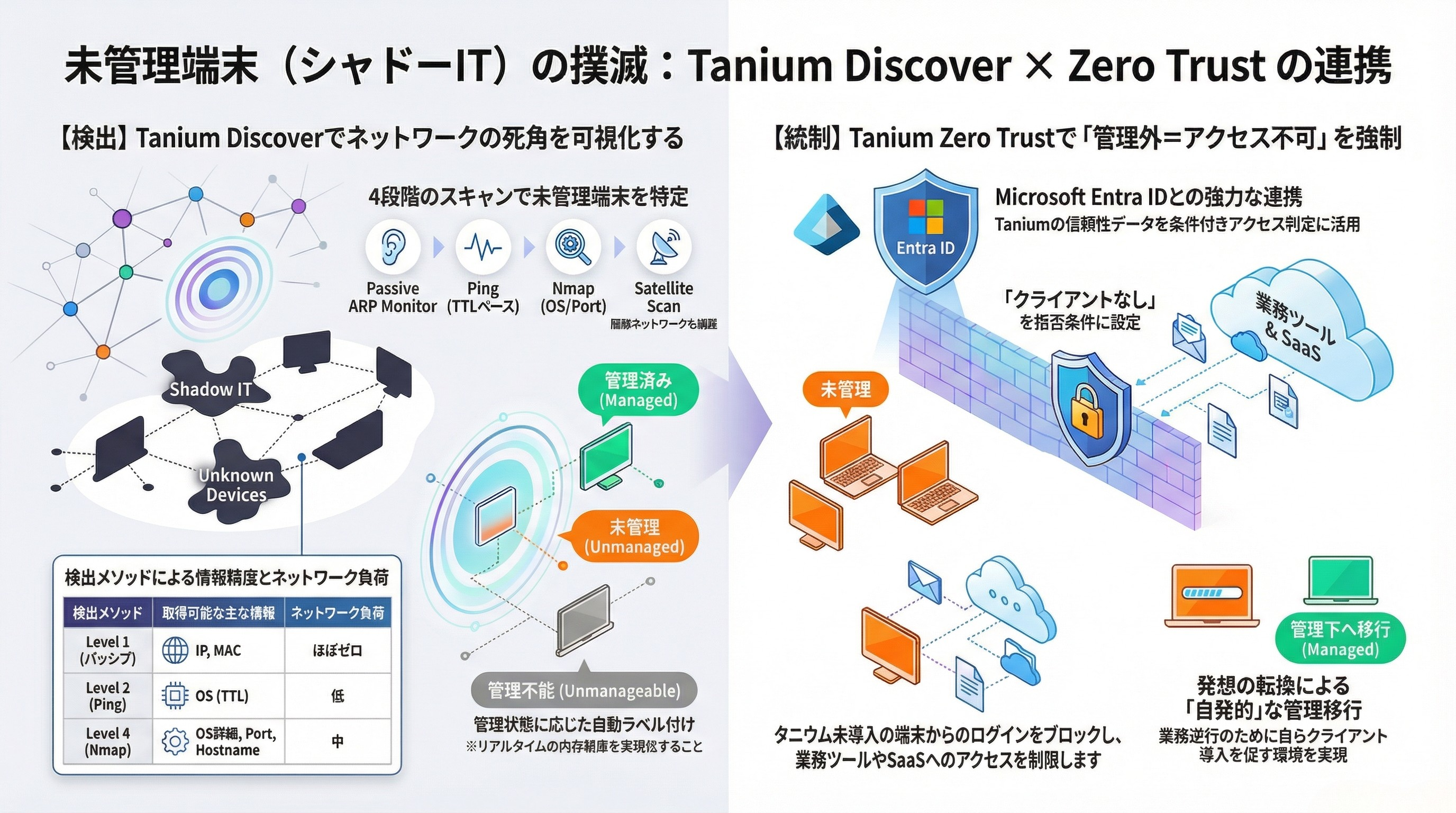セキュリティ担当者が「非管理端末(シャドーIT)の撲滅」という課題に向き合う際、Taniumユーザーであれば真っ先に思い浮かべるのが「Tanium Discover」でしょう。しかし、誤解を恐れずに言えば、Discoverだけでは非管理端末を潰しきることはできません。なぜなら、Discoverはあくまで「検出」するためのツールであり、そこにTaniumクライアントをインストールして「管理下に入れる(=潰し込む)」という実行部分までは担わないからです。