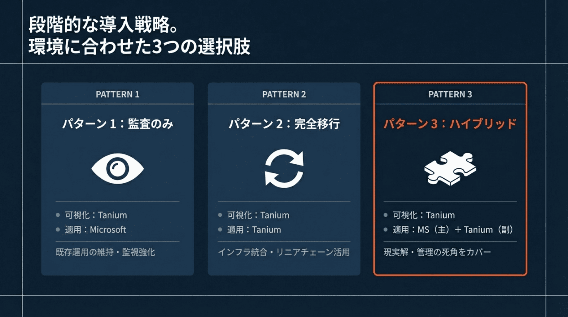 実際の事例として最も多く採用されているのが、パターン1の「可視化のみTanium」と、このパターン3の「ハイブリッド」運用です。平時はWSUSやWUfBで運用し、どうしてもパッチが当たらない端末に対してのみTaniumの配信力を使う——この現実的なアプローチが、多くの組織に支持されています。
