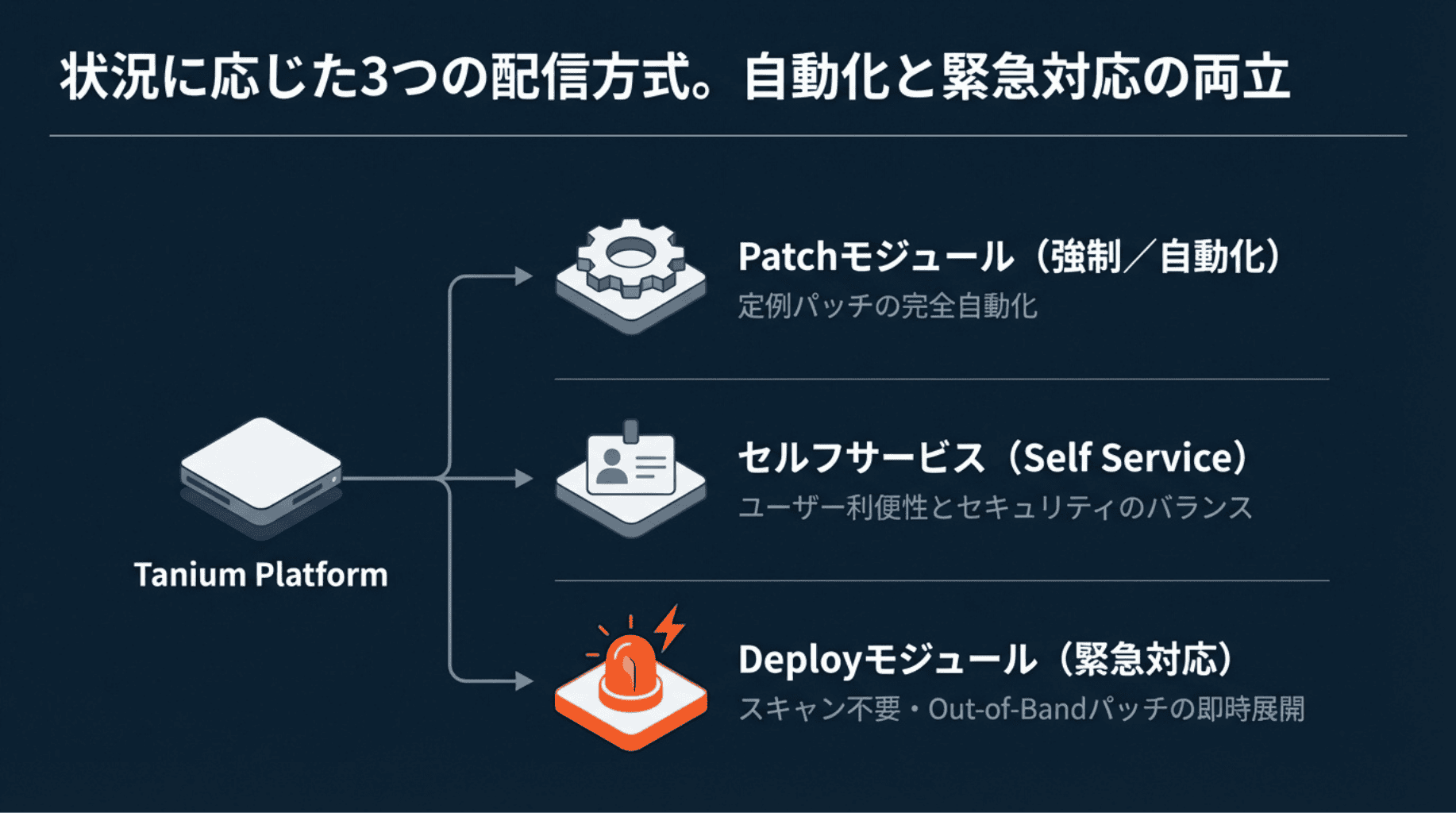 Taniumでパッチを配信する場合、状況に応じて以下の3つの方法を使い分けることができます。