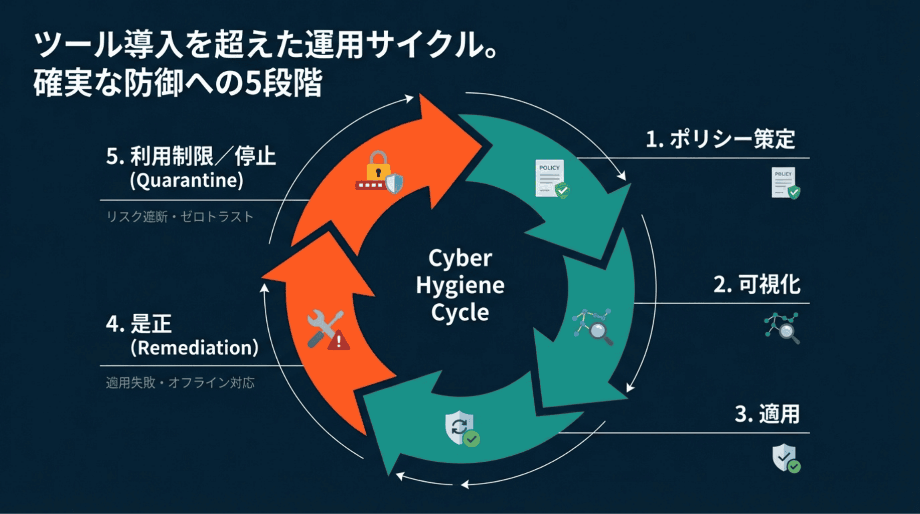 ツールを導入するだけではセキュリティは担保されません。以下の5つのステップをサイクルとして回すことが重要です。