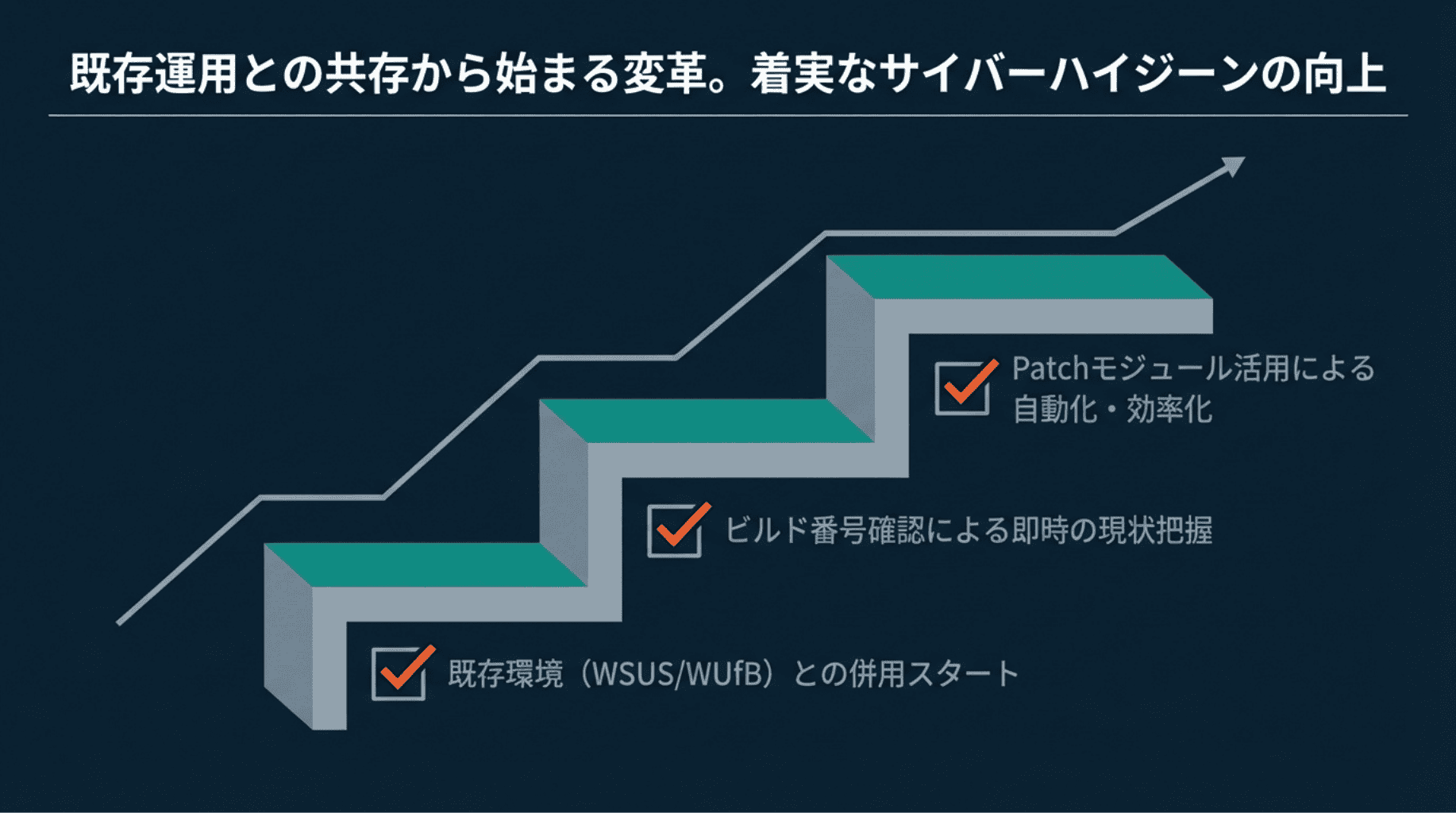 Windowsのパッチ管理は、単にアップデートを流せば終わりではありません。ポリシーを決め、可視化で現状を把握し、課題に対して適切な対策を検討する——このサイクルを回すことが重要です。